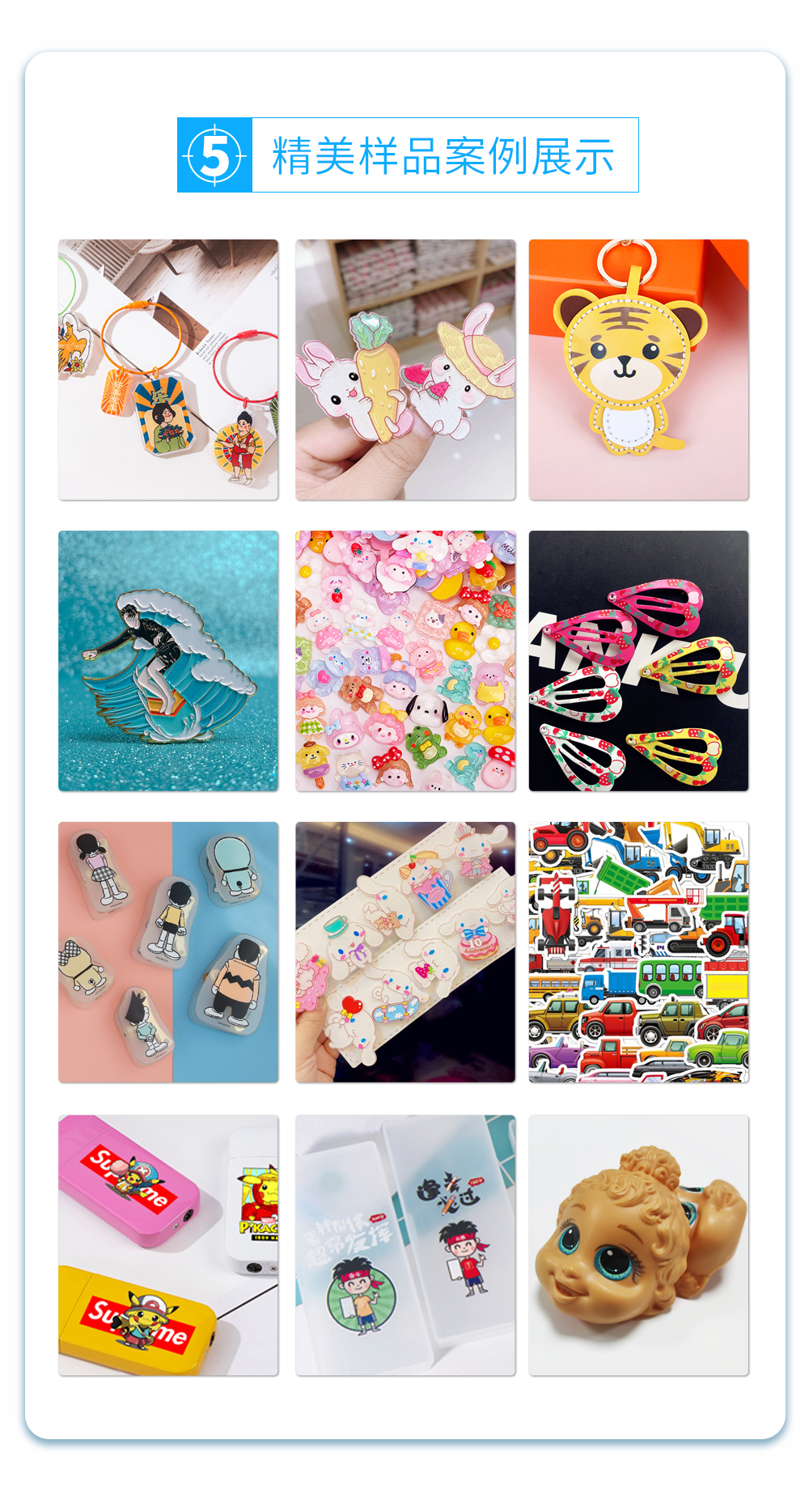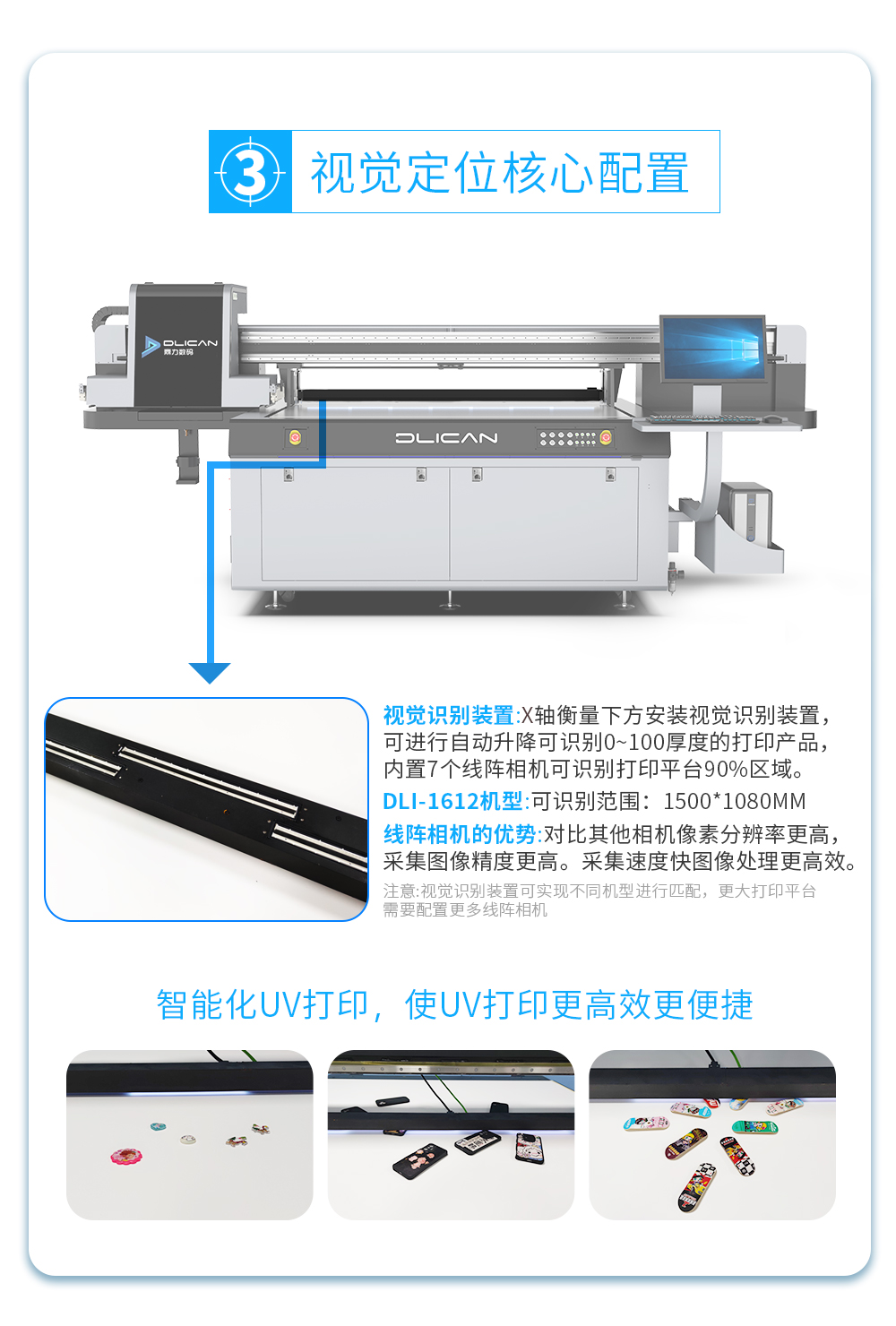 產品描述:鼎力數碼視覺定位uv打印機不需要打印產品定位框,各種異形材料隨意擺放到平臺自動識別可以精準打印產品。