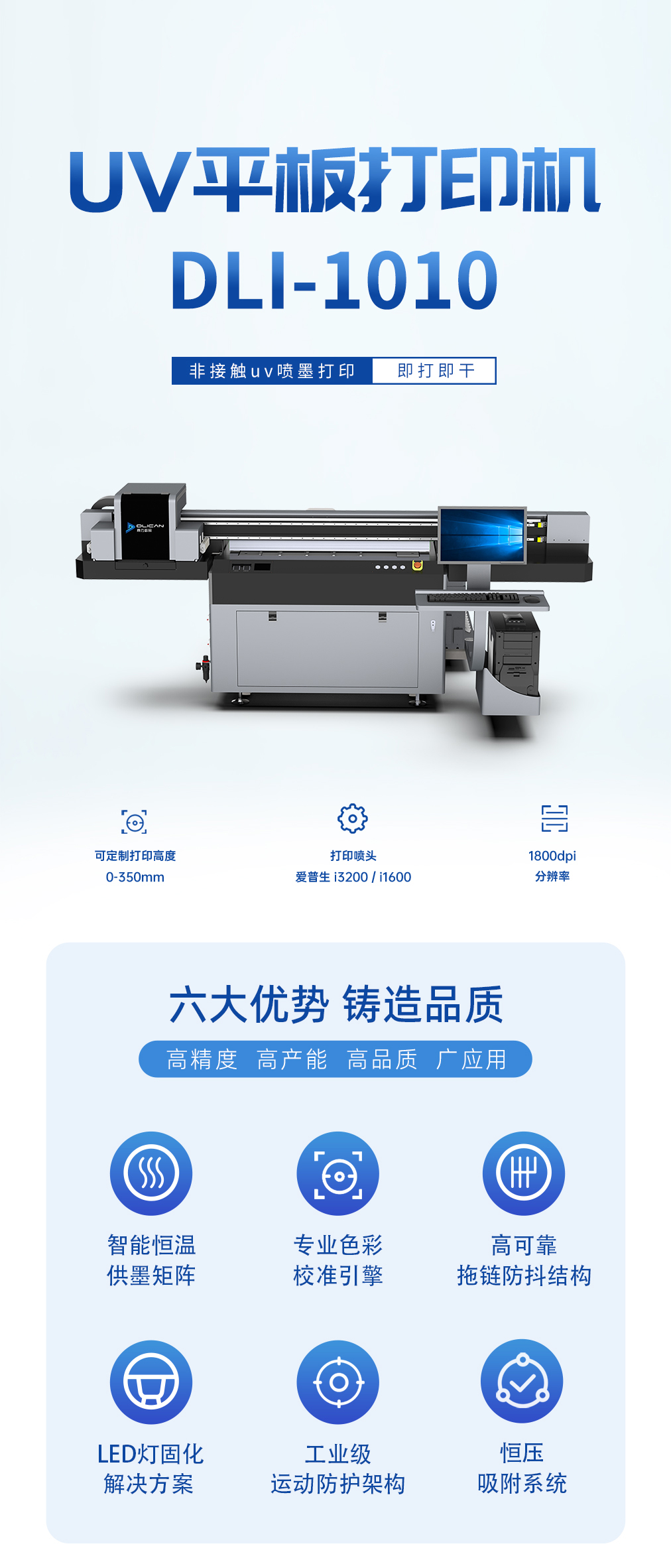 產品描述:打印尺寸1m*1m,小巧機身靈活應對多種打印需求,穩定高效,白彩光油同步打印,高分辨率彩印效果,打印圖像效果細膩清晰。